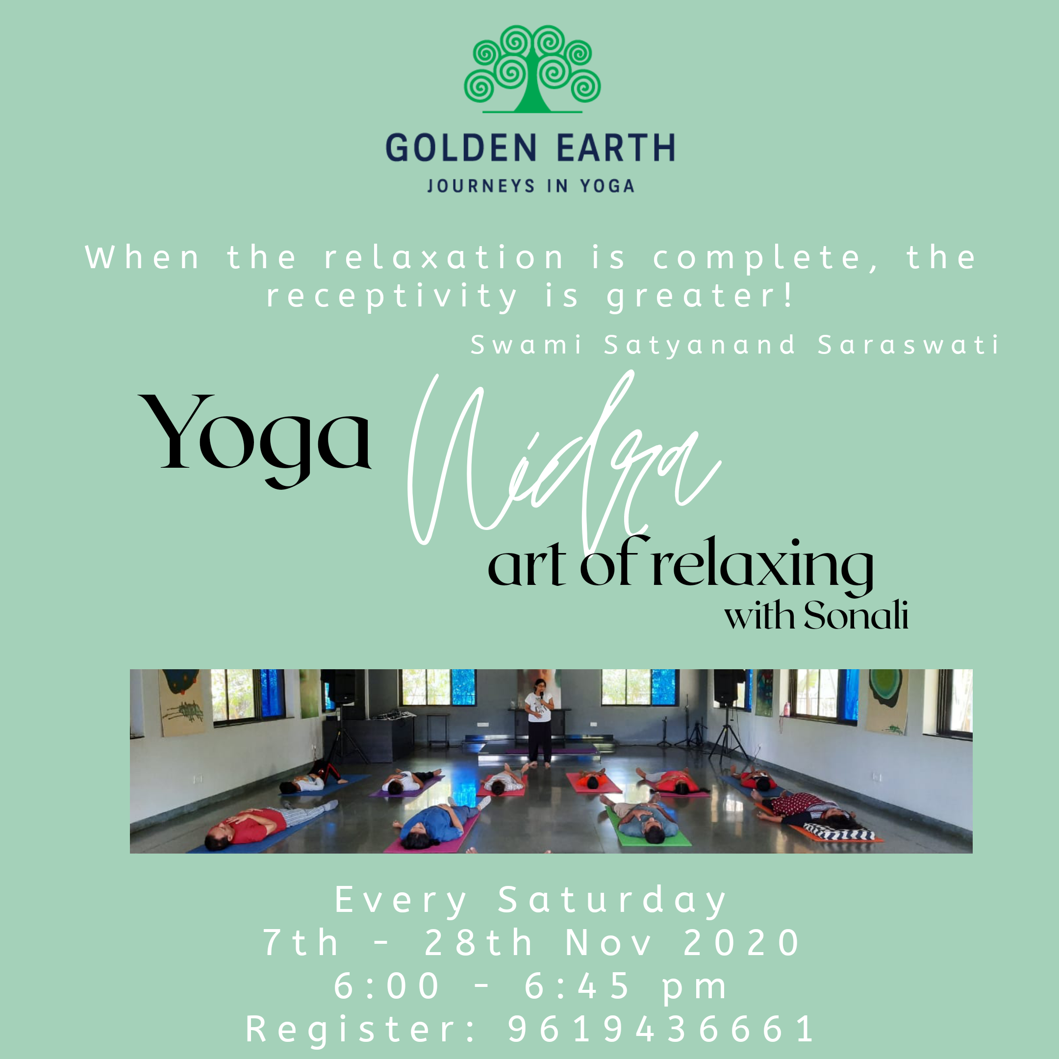 Golden Earth is conducting Yoga Nidra series for people in all age groups. It starts on 7th Nov 2020 and ends on 28th Nov 2020. Yoga Nidra is also called as the psychic sleep. It is one of the best yogic intervention mechanism to cope with the problem of stress! The sessions are currently running and you can connect with us to join!