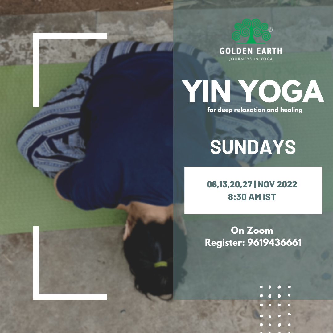 Golden Earth invites you to Yin Yoga sessions. This batch will begin on 6th Nov 2022 and run till 27th Nov 2022. Gift yourself or your loved ones the experience of Yin Yoga. Yin Yoga is a slow, passive yoga practice for deeper healing and relaxation. Join us once a week every Sunday morning 8:30 - 9:30 am. Sonali has created a simple and effective sessions to go in deeper within yourself; It's great for releasing stress and taking care of yourself.